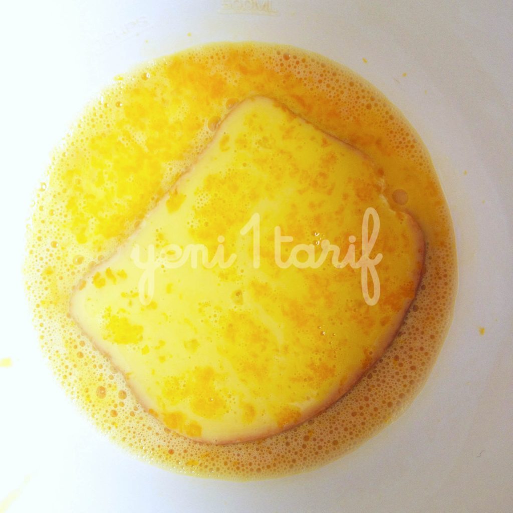 ?nce dilimledi?imiz ekmeklerimizi önce yumurtal? kar???ma atal?m, her iki k?sm? da iyice ?slatal?m. Size tavsiyem hiç bir dilimi 30 saniyeden fazla tutmay?n. Çünkü s?v?y? fazla emen ekmek çok yumu?ay?p, parçalanmaya ba?lar. Bu sebeple her seferinde bir dilim ile ilgilenmenizi tavsiye ederim.
