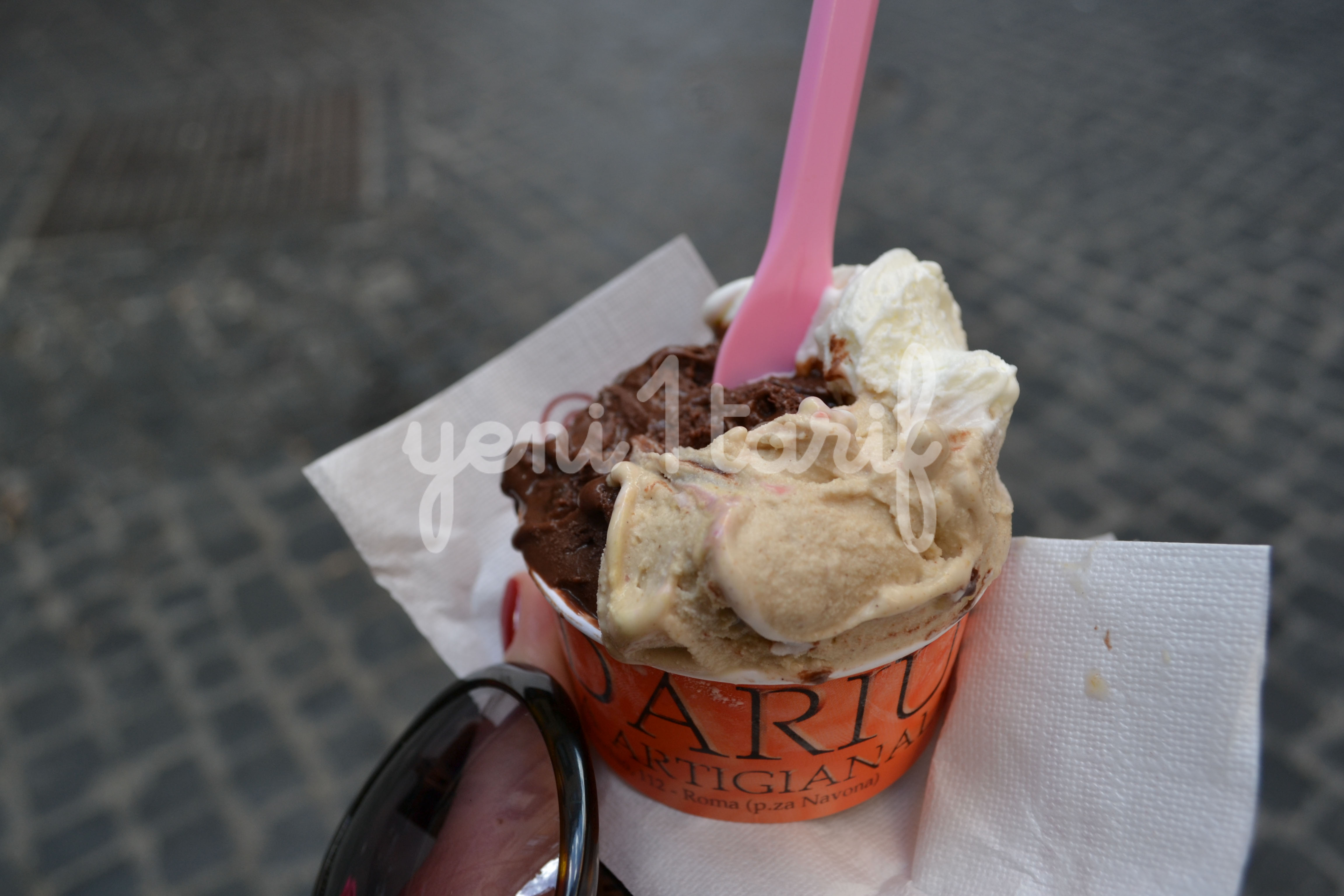 Bitmek bilmeyen yürüyü?lerimize ve yiyip içmelerimize ra?men, dondurma yemeden gün sona ermiyordu. Gene öyle bir anda, Sant’ Agnese in Agone gezimizin ard?ndan, sadece biraz ‘dinlenmek’ bahanesi ile gene dondurmac? aramaya ba?lad?k. Sonunda ayn? bölgede Governo Vecchio soka??ndaki upuzun kuyru?u gördük. Gerçi Roma turist kaynad??? için neredeyse tüm dondurmac?lar böyle kalabal?k, ancak çok sorgulamadan denemeye karar verdik.. Normalde klasik tatlar haricindekileri denemeye bay?l?r?m ancak dondurma reyonundaki görüntü benim için favori olamad?. Üzerine bolca sos, içine bolca g?da boyas? eklenmi? ürünleri sevmiyorum.