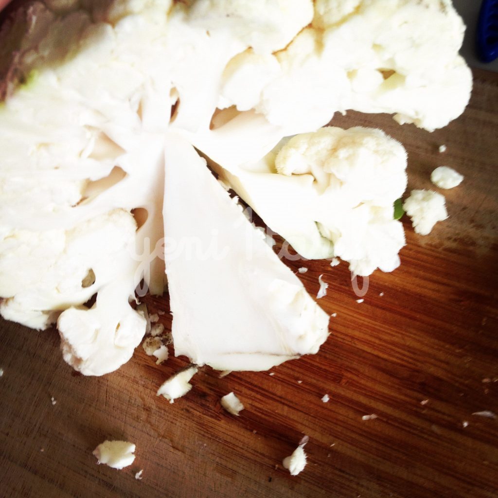 Karnabahar?m?z? ortadan ikiye bölelim ve foto?rafta da gördü?ünüz gibi ortas?ndaki sert kökü üçgen yap?p ç?kartal?m. Bundan sonra iri çiçekler haline getirmek daha kolay olacak. ?ri çiçekler halinde kalana kadar köklerini al?p temizleyelim. Yap?s? gere?i üzerinde toprak tutan bir sebze, dolay?s? ile bol so?uk suda bir kaç y?kamak gerekecek.