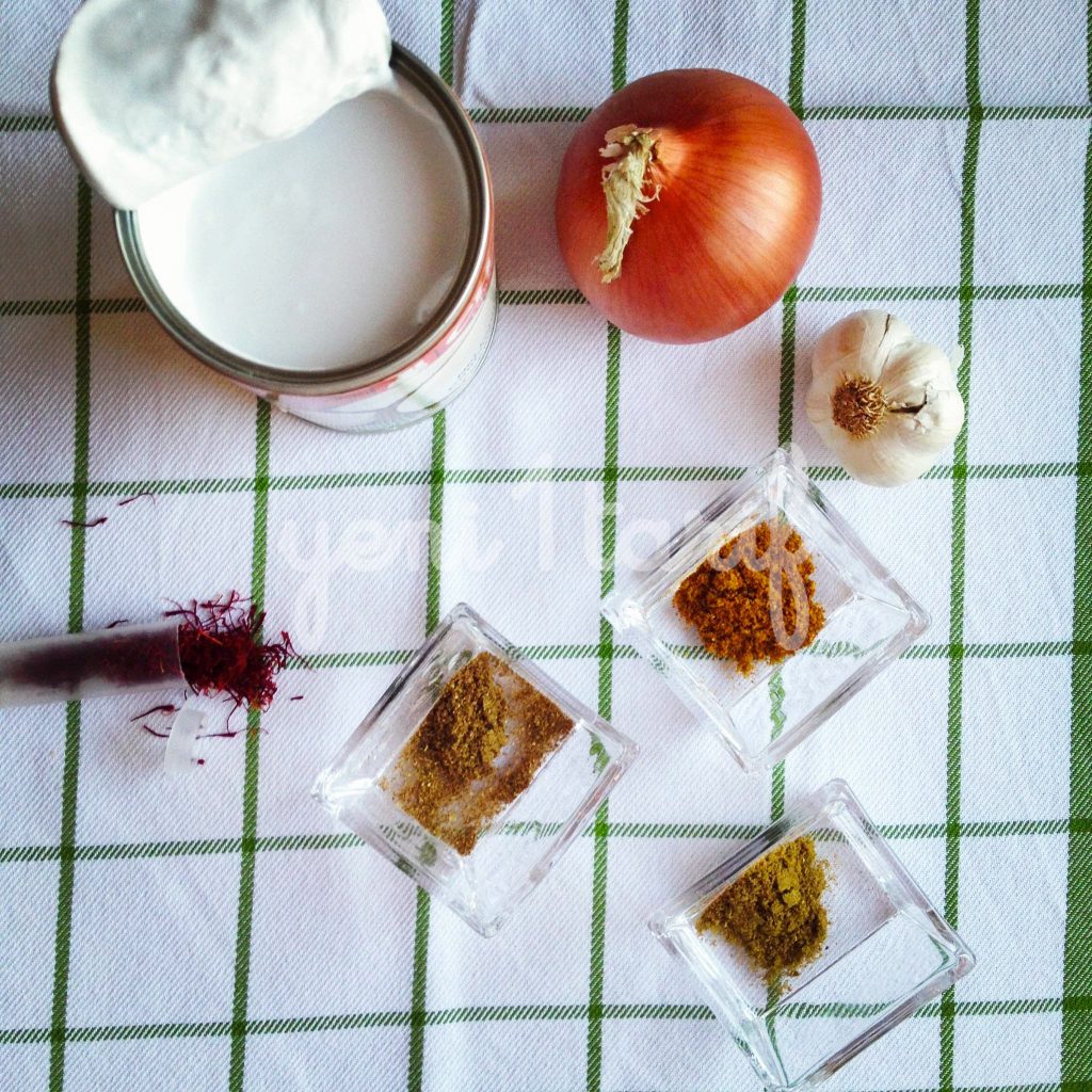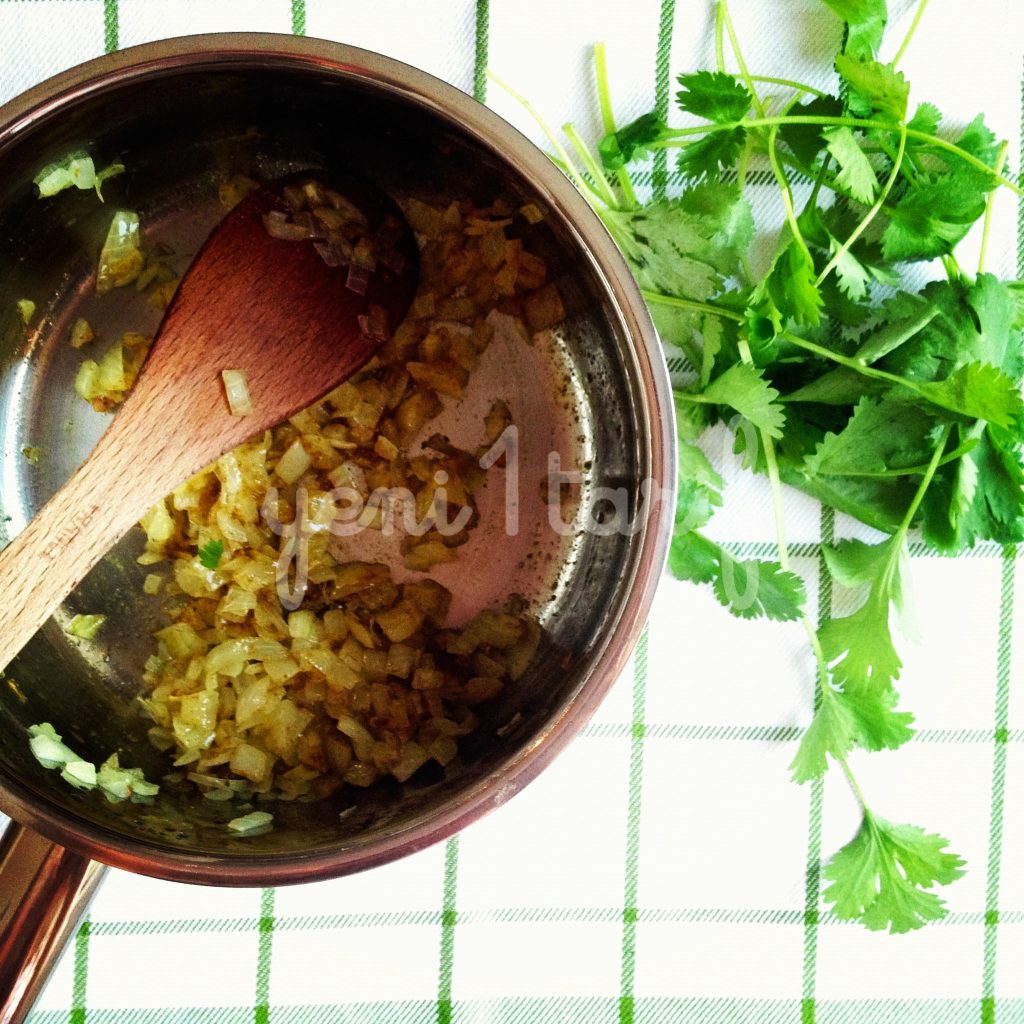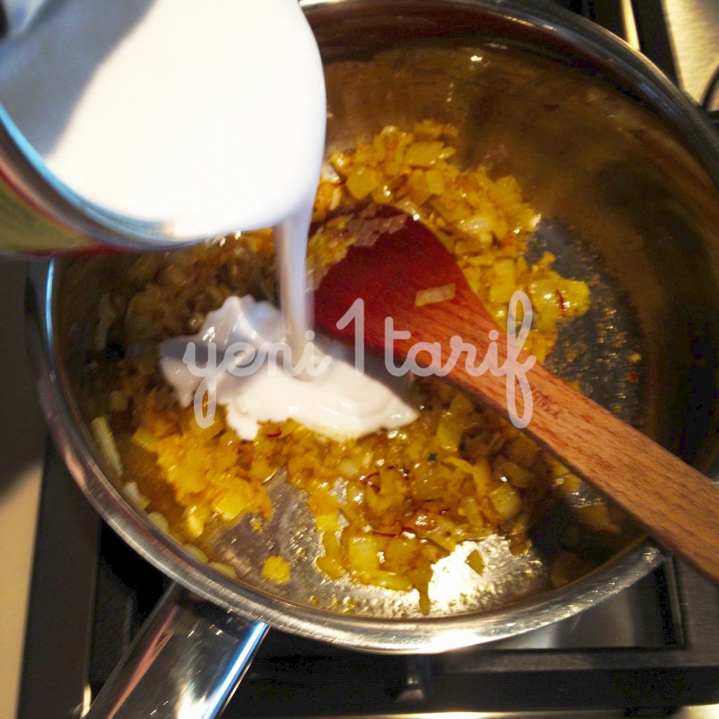 Tavu?umuz pi?ti?ine ve ?l?nmaya b?rakt???m?za göre sosumuza ba?layabiliriz; tenceremize ya??m?z? koyup minik zar halinde do?rad???m?z so?anlar?m?z? k?s?k ate?te pi?meye b?rakal?m. Bu esnada minik bir kapta kimyon, garam masala, köri tozu ve safran? kar??t?ral?m. So?anlar?m?z ?effafla?maya ba?lad???nda bu kar???mdan 2 çay ka????n? ekleyelim ve kokular? ç?kana kadar kavural?m. Daha sonra sar?msak ve domates püremizi ekleyip bir dakika daha pi?meye b?rakal?m.