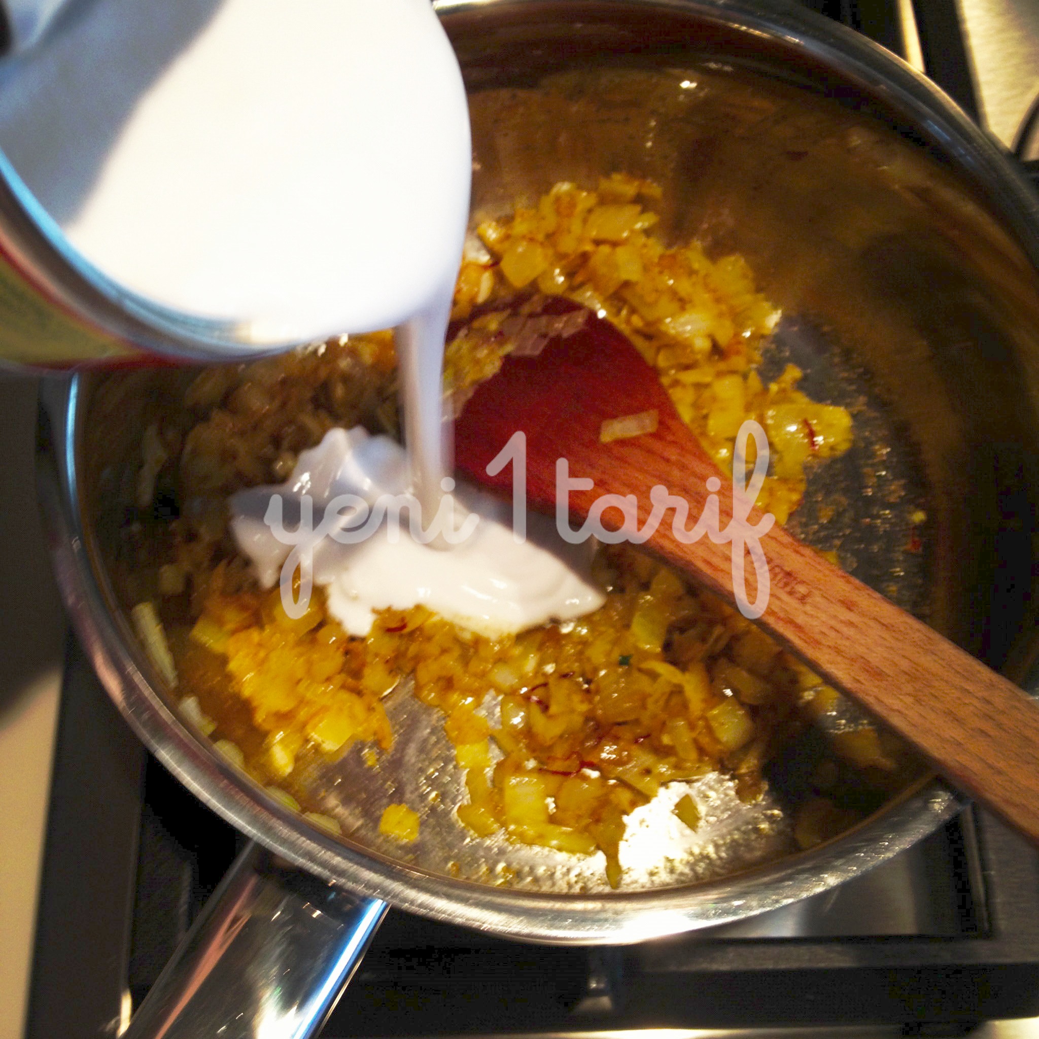 Olu?an kar???m?m?za Hindistan cevizi sütümüzü ekleyebiliriz. Bu noktada ate?i orta dereceye almakta yarar var. Sosumuz ne zaman kaynamaya ba?larsa, o anda k?s?p koyula?mas? için kaynamaya b?rakal?m. Ancak fokur fokur kaynamamas? gerekiyor, minik balonlar ç?kartmas? yeterlidir (simmer).