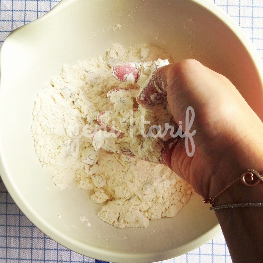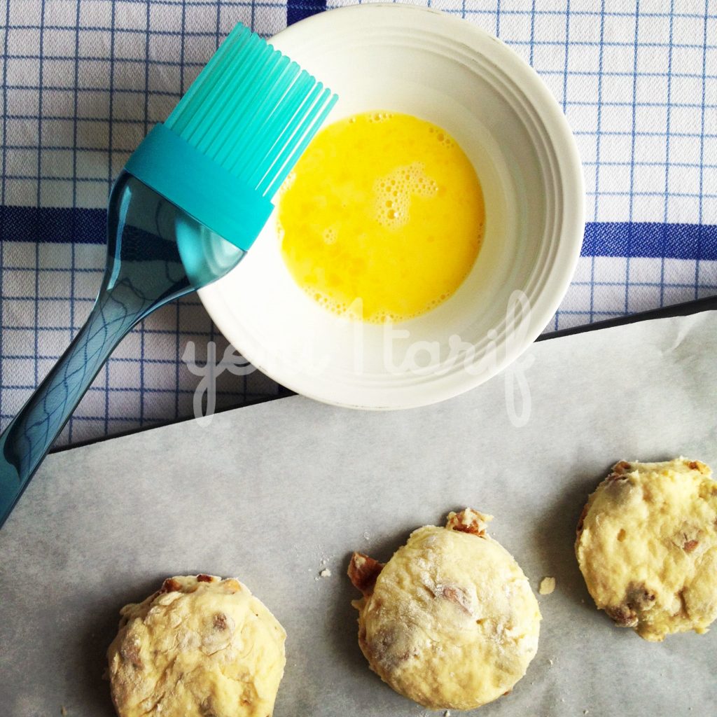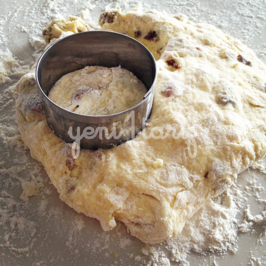 Kar???m? temiz ve kuru bir tezgaha al?n ve ekstra belirtti?im 2 yemek ka???? unu üzerine boca edin ve sanki hamur yo?urur gibi avuçlar? da i?in içine katabiliriz. Sonunda ekmek hamuru gibi bir k?vam elde ediyor olaca??z. Avuç içlerinizde kal?nl??? 1.5 cm olacak ?ekilde düzeltip, çap? 6 cm olan yuvarlak kesme aleti ile daireler olu?tural?m. Daha fazla scone elde etmek için hamuru tekrar yo?urup, açabilirsiniz. Tüm hamur bitene kadar kullanmaya özen gösterin, ziyan olsun istemeyiz 🙂 Baz? tariflerde kocaman bir yuvarlak yap?p onu havuç ?eklinde de porsiyonlad?klar?n? görebilirsiniz. Ben top ekmek ?ekli vermeyi seviyorum, gerisi sizin zevkinize kalm??.