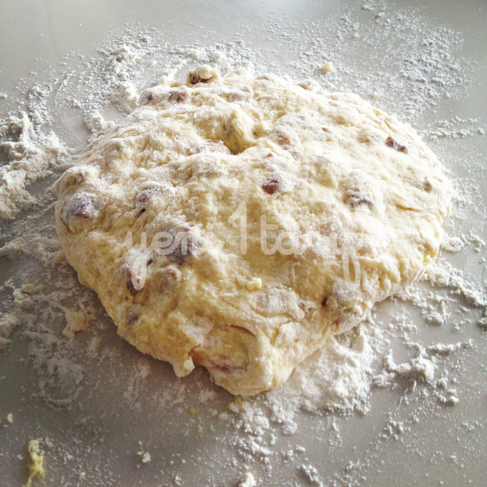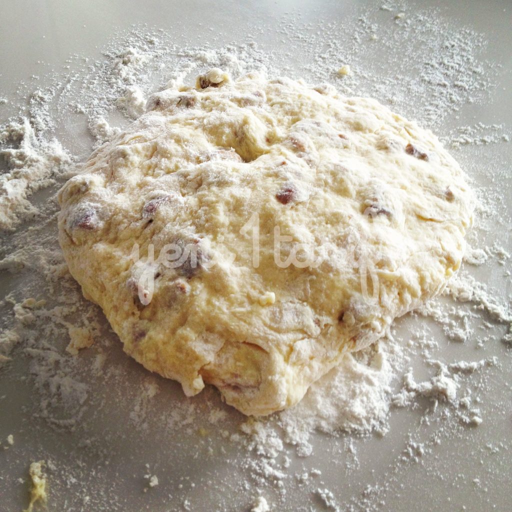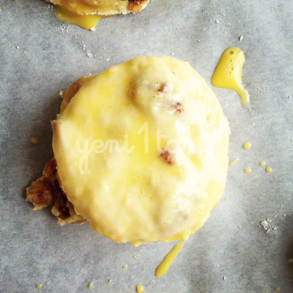 Kar???m? temiz ve kuru bir tezgaha al?n ve ekstra belirtti?im 2 yemek ka???? unu üzerine boca edin ve sanki hamur yo?urur gibi avuçlar? da i?in içine katabiliriz. Sonunda ekmek hamuru gibi bir k?vam elde ediyor olaca??z. Avuç içlerinizde kal?nl??? 1.5 cm olacak ?ekilde düzeltip, çap? 6 cm olan yuvarlak kesme aleti ile daireler olu?tural?m. Daha fazla scone elde etmek için hamuru tekrar yo?urup, açabilirsiniz. Tüm hamur bitene kadar kullanmaya özen gösterin, ziyan olsun istemeyiz 🙂 Baz? tariflerde kocaman bir yuvarlak yap?p onu havuç ?eklinde de porsiyonlad?klar?n? görebilirsiniz. Ben top ekmek ?ekli vermeyi seviyorum, gerisi sizin zevkinize kalm??.