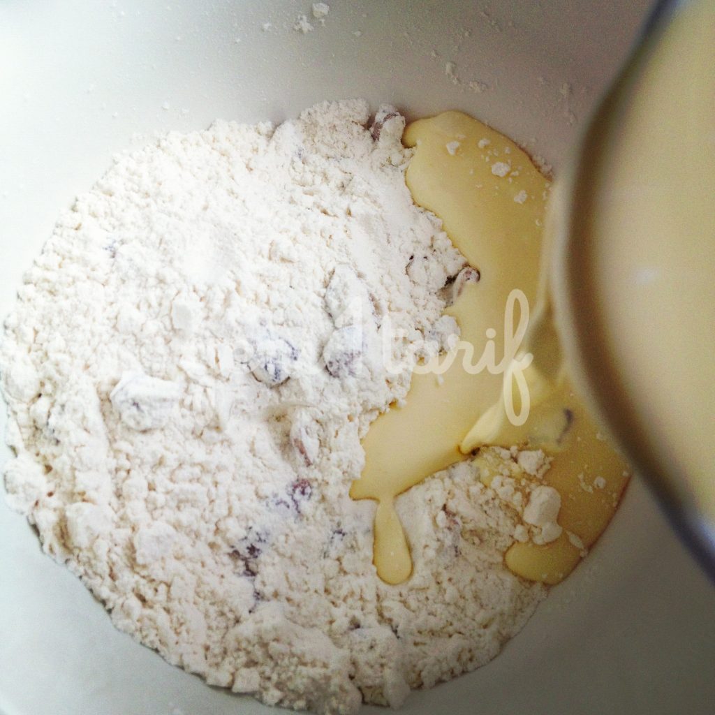 ?imdi ya? ve kuru malzemeleri birbirine kar??t?rma an?; ancak sütlü-yumurtal? kar???m?n tamam?n? dökmeyece?iz. 265 gr’l?k un tarifine bu kar???m?n sadece 4’te 3’ü yeterli olacak.