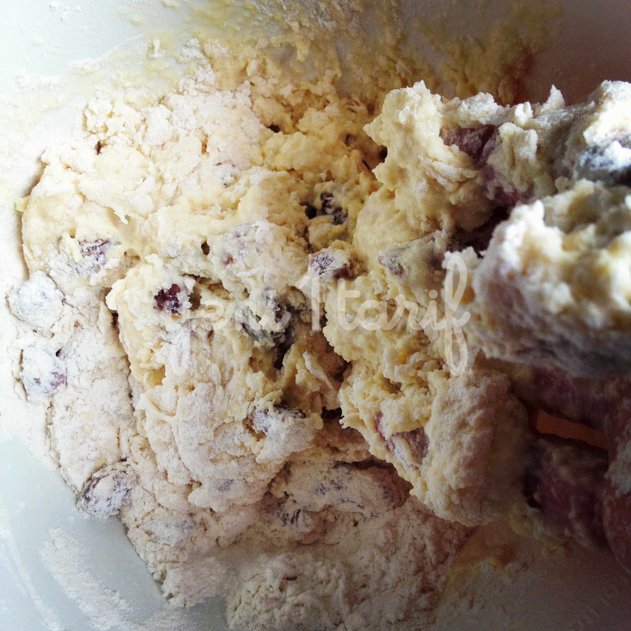 Ba?ka bir kapta ise kendi kabaran unumuzu ve kuru incirlerimizi elimizle güzelce kar??t?ral?m. Kendi kabaran un ne diyecek olursan?z da marketlerde sat?lan sade, kabartma tozu içeren kek unlardan bahsediyorum. Yurt d???ndaki gibi ne yaz?k ki ‘self-raising’ un sat?lm?yor, ancak ?ekersiz ve aromas?z olan kek unlar da i?inizi görecektir. Paketlerin üzerinde ‘kabartma tozu içerir’ yazanlar? almay? unutmay?n. Buradaki önemli nokta ise tüm incirlerin ya da kuru meyvelerin un ile iyice kaplamas?.