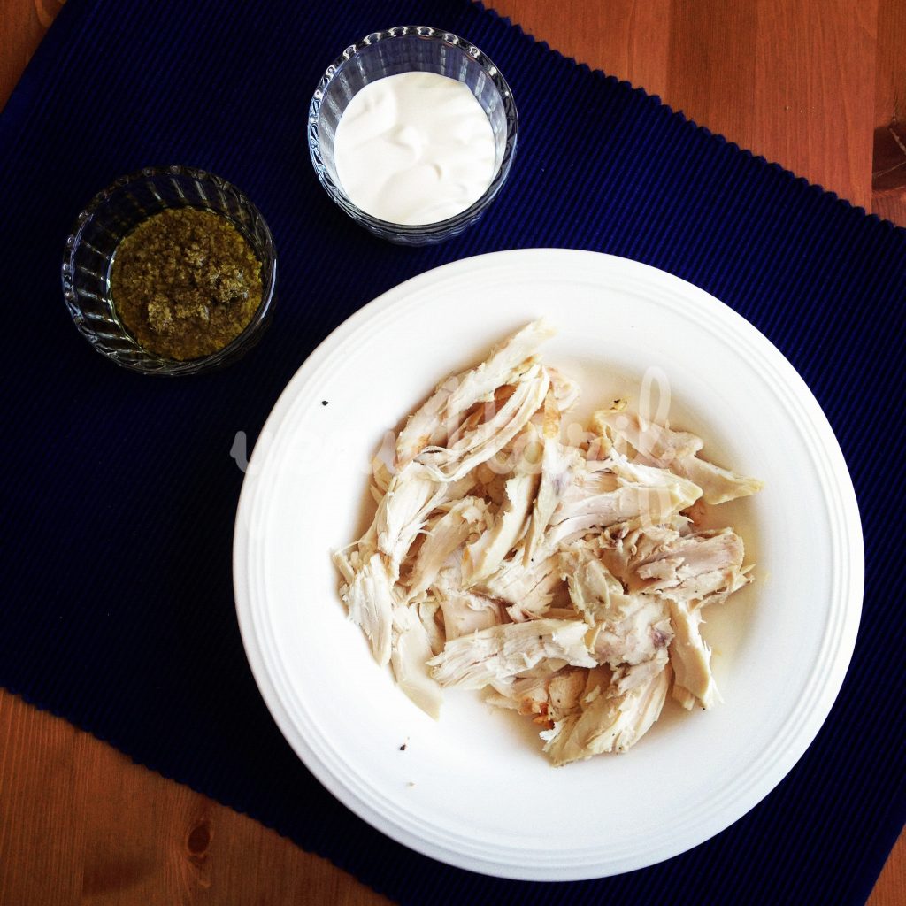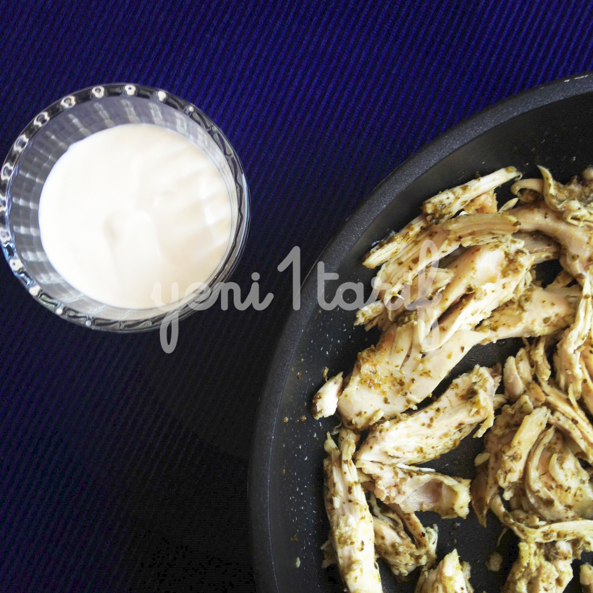 Bu noktada kremam?z?n tamam?n? ekleyebiliriz. Krema eklememizin sebebi, pesto sosunun daha hafif hale gelip, tavuklar? birbirine do?al bir yap??t?r?c? ile yap??t?rmak. Böylece sandviçimizin içinde da??lmayacaklar.