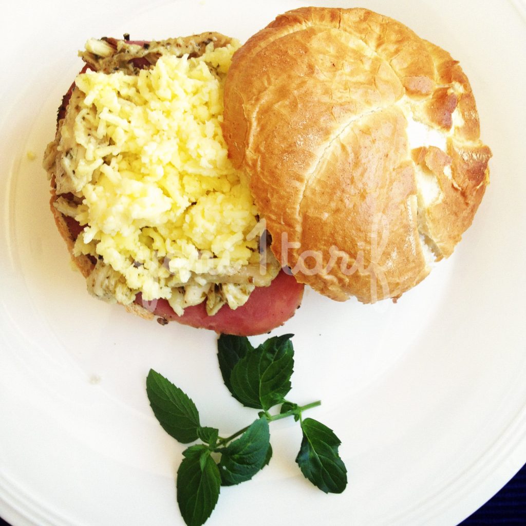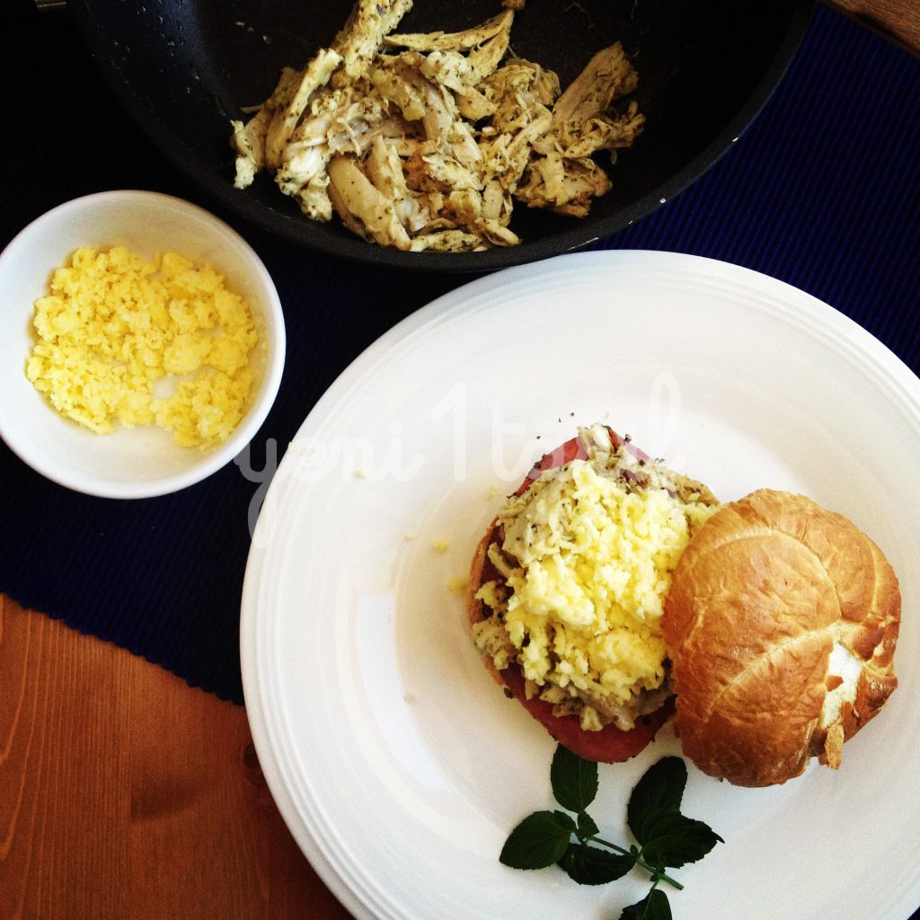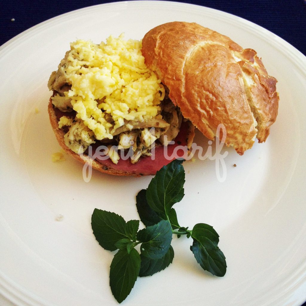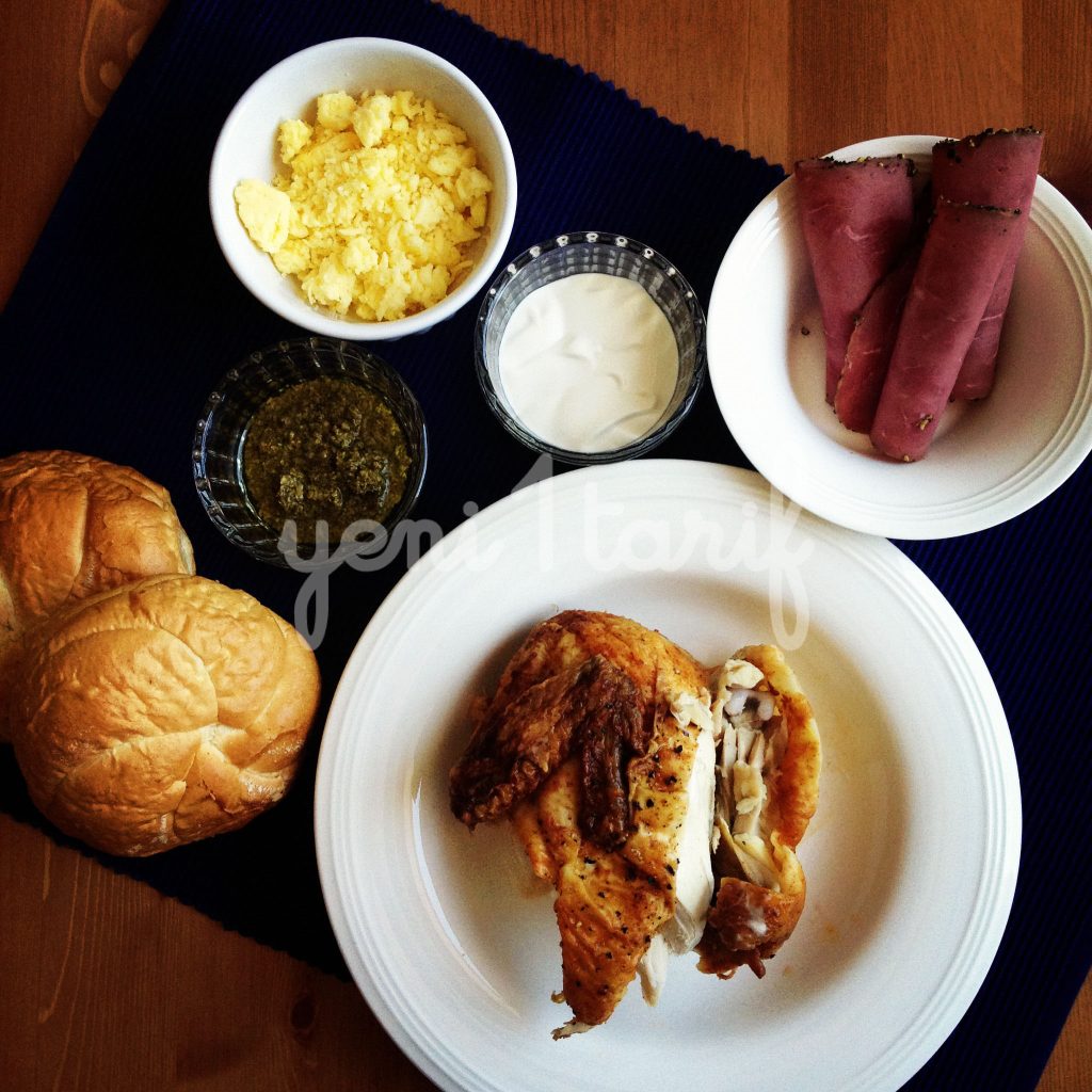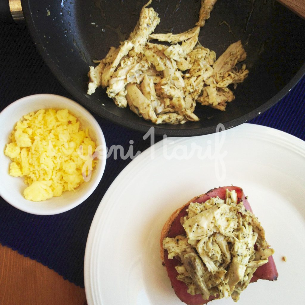 Haz?r olan pesto soslu tavu?umuzu bir kenara al?p, sandviçimizi olu?turmaya ba?layabiliriz. Tavu?a krema koydu?umuz için ben ekme?e ekstra bir sos eklemeyece?im; bu nedenle en alta hindi jambonumuzdan bir dilim ekliyorum. Evde hindi jambon oldu?u için bunu kulland?m; siz de ne varsa onu ekleyebilirsiniz tabii ki. Üzerine tepeleme olacak ?ekilde tavuklar?m?zdan ekleyelim.