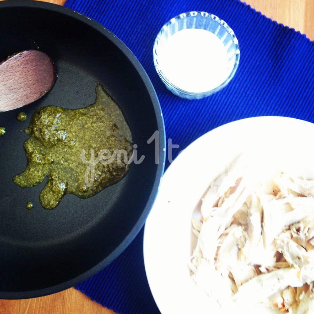 Tavam?z?n alt?n? aç?p, pesto sosumuzu ekliyoruz. Sosumuzun güzelce ?s?nmas? gerek. Tavu?umuz hali haz?rda pi?mi? oldu?u için sosu tamamen k?zd?rd?ktan sonra ekliyoruz. Sos ile tavu?un birle?mesini ve ?s?nmas?n? bekliyoruz.